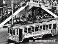 玉川線廃止時に運行された花電車に群がる人々。